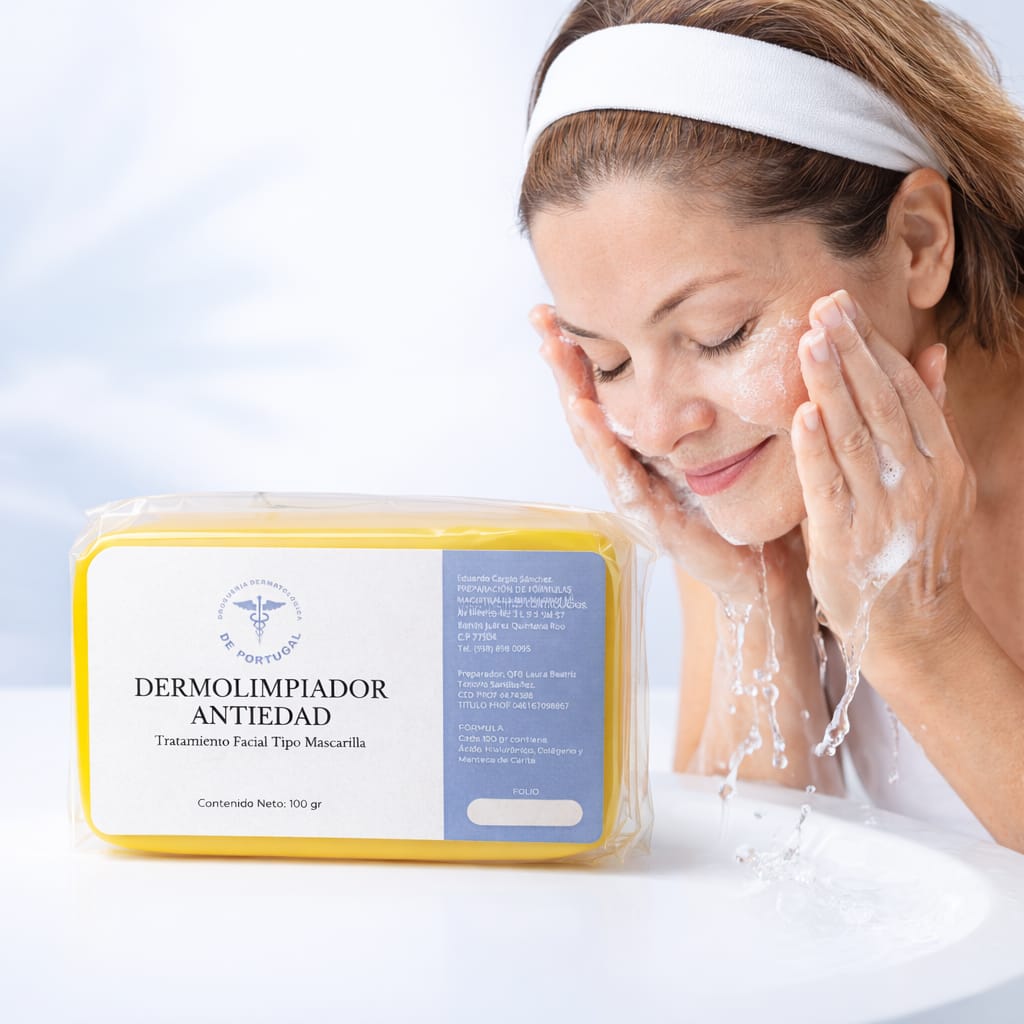 El Jabón antiedad es una barra dermolimpiadora facial que brinda una limpieza profunda, trabajando como auxiliar para contrarrestar los signos de la edad en la piel.