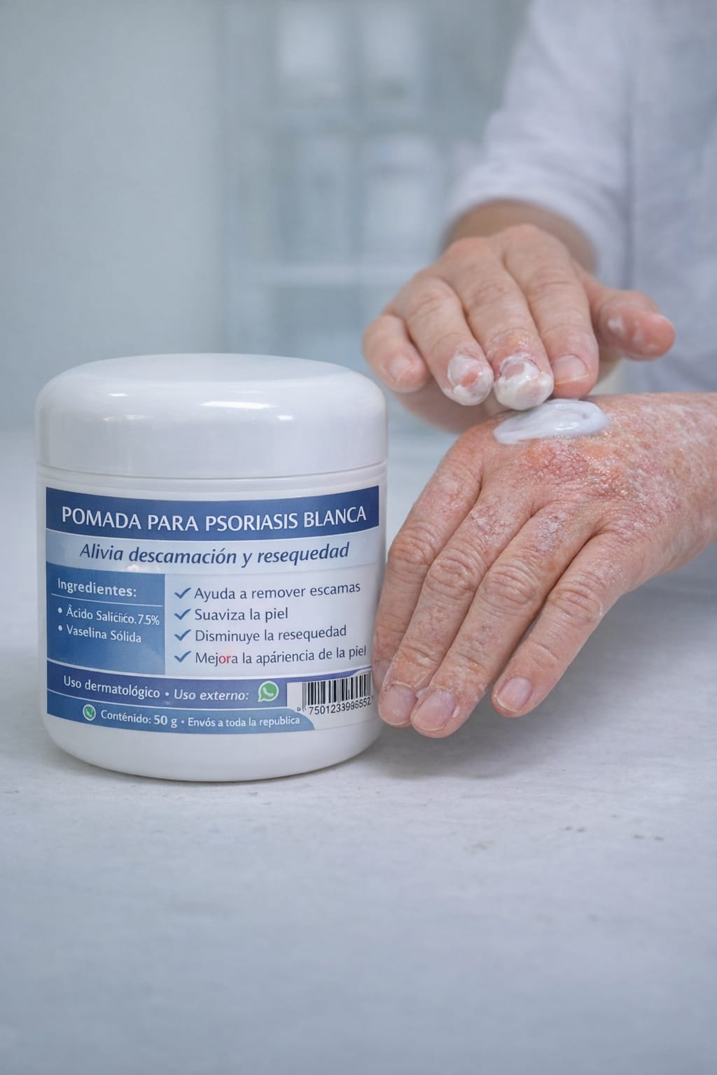 La Pomada para Psoriasis Blanca es una Fórmula Magistral coadyuvante de día, para el tratamiento de la psoriasis, aliviando el enrojecimiento y descamación de las pieles psoriásicas gracias a sus componentes como el ácido salicílico que ayuda a reducir las lesiones psoriásicas que ayuda a disminuir la inflamación y el enrojecimiento.