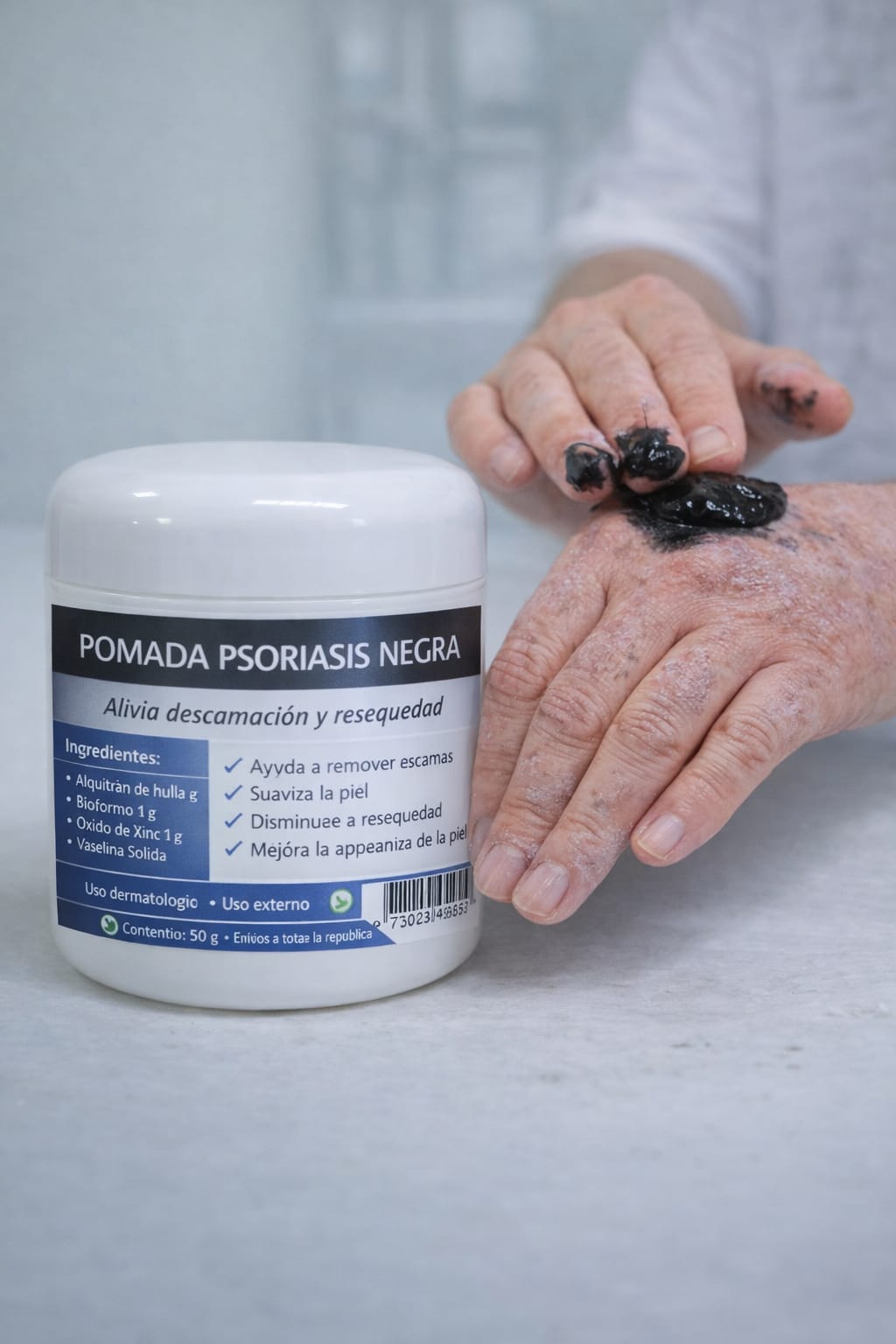 Pomada para Psoriasis Negra es una Fórmula Magistral coadyuvante de noche para el tratamiento de las lesiones psoriásicas.